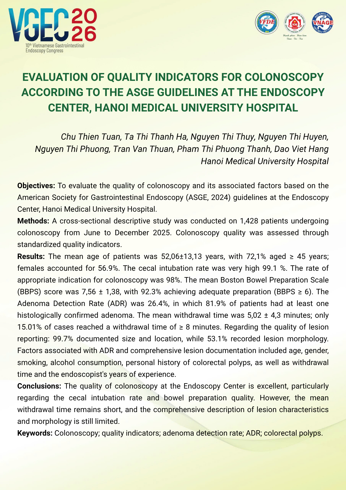 Evaluation of Quality Indicators for Colonoscopy According to the ASGE Guidelines at the Endoscopy Center, Hanoi Medical University Hospital
