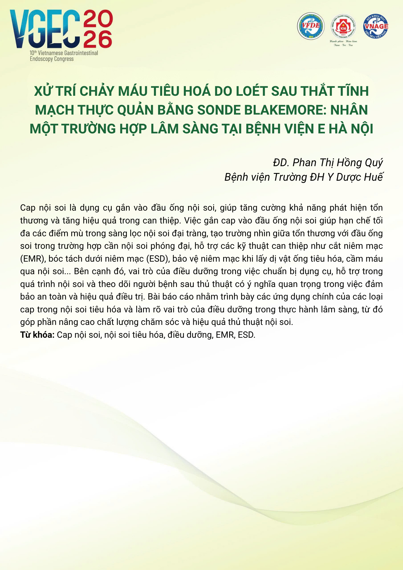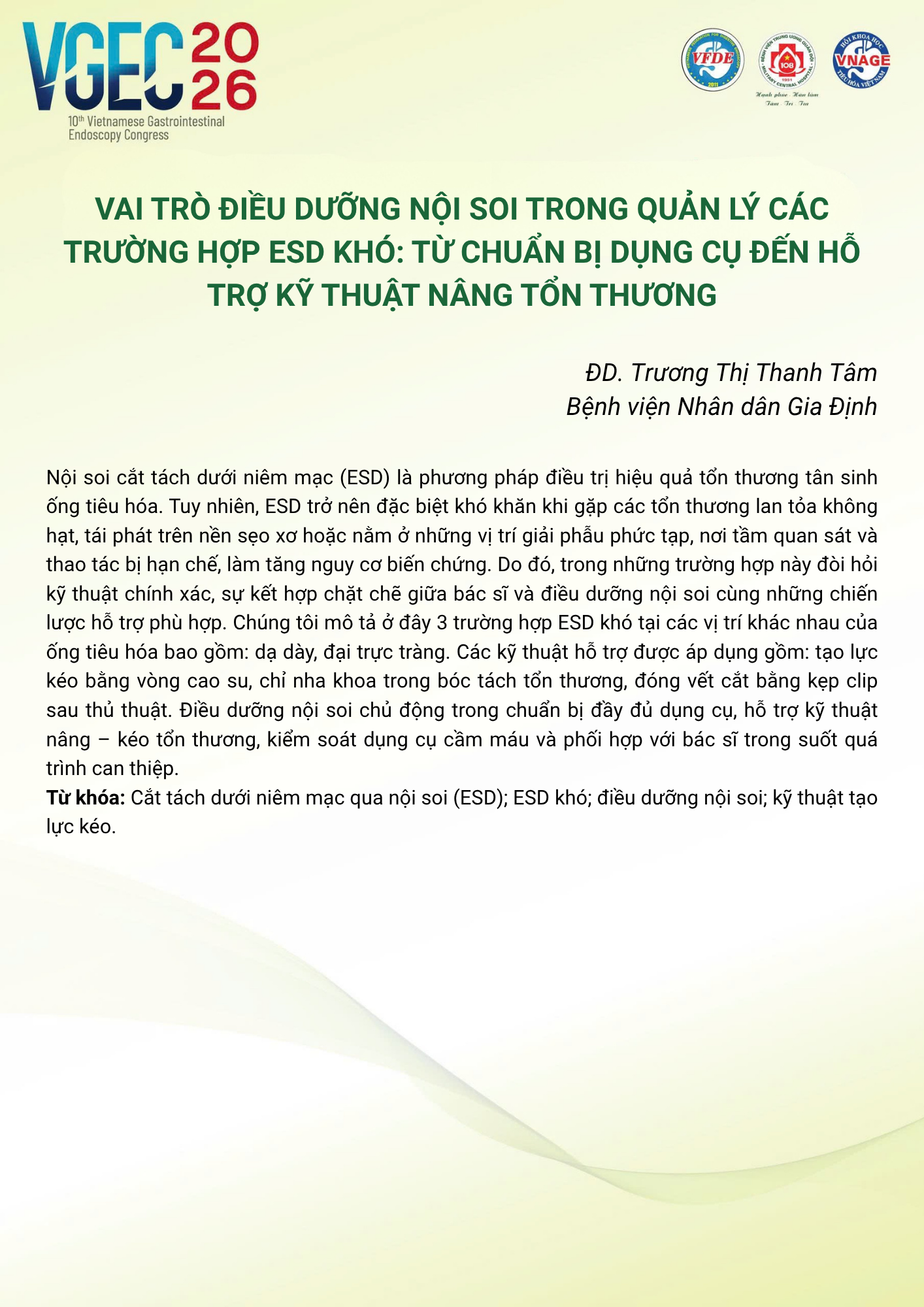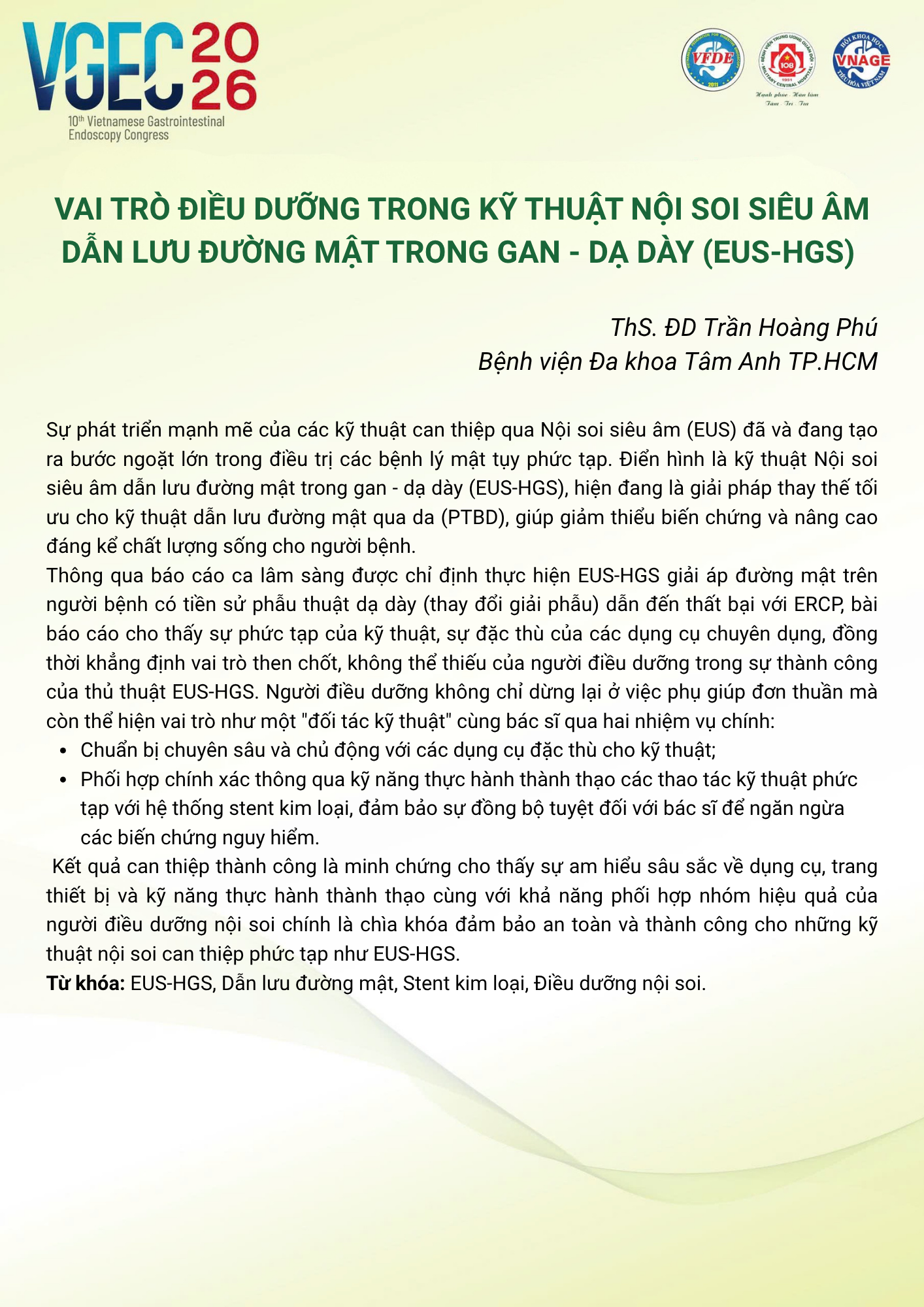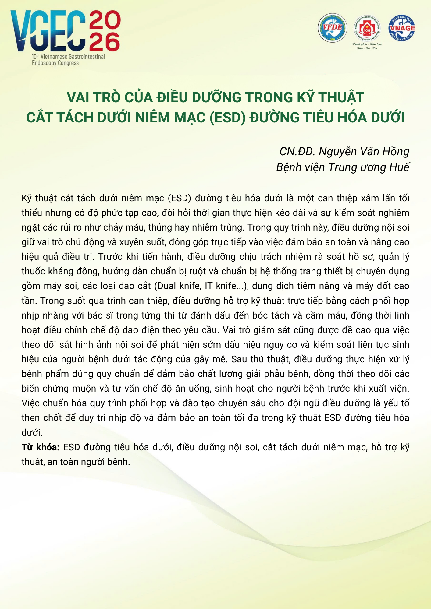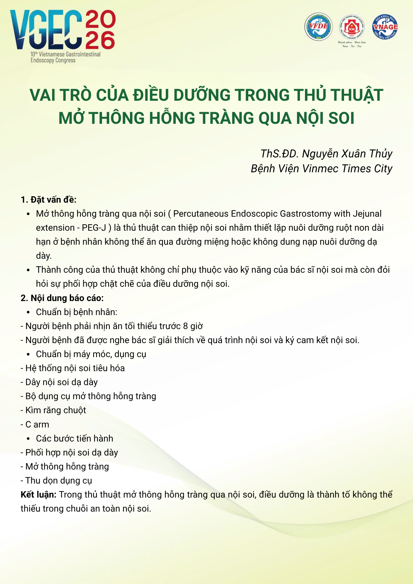 CHỦ ĐỀ: VAI TRÒ CỦA ĐIỀU DƯỠNG NỘI SOI TRONG TỐI ƯU HÓA AN TOÀN VÀ HIỆU QUẢ CỦA CÁC THỦ THUẬT NỘI SOI CAN THIỆP