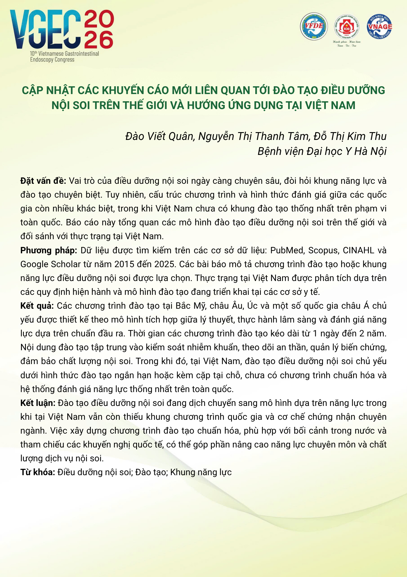 CHỦ ĐỀ: ĐÀO TẠO VÀ PHÁT TRIỂN ĐIỀU DƯỠNG NỘI SOI: NÂNG CAO CHẤT LƯỢNG VÀ HƯỚNG TỚI PHÁT TRIỂN BỀN VỮNG