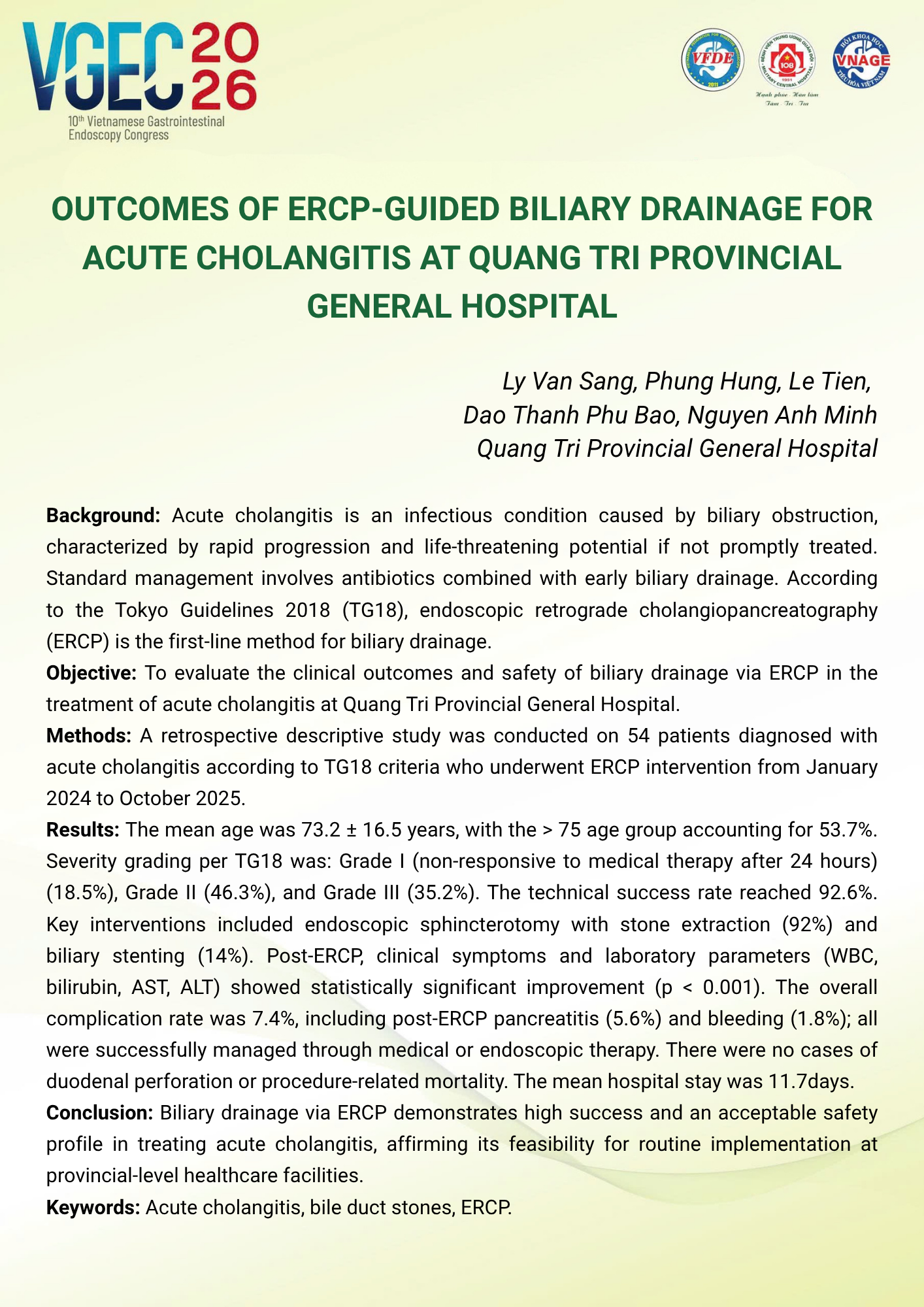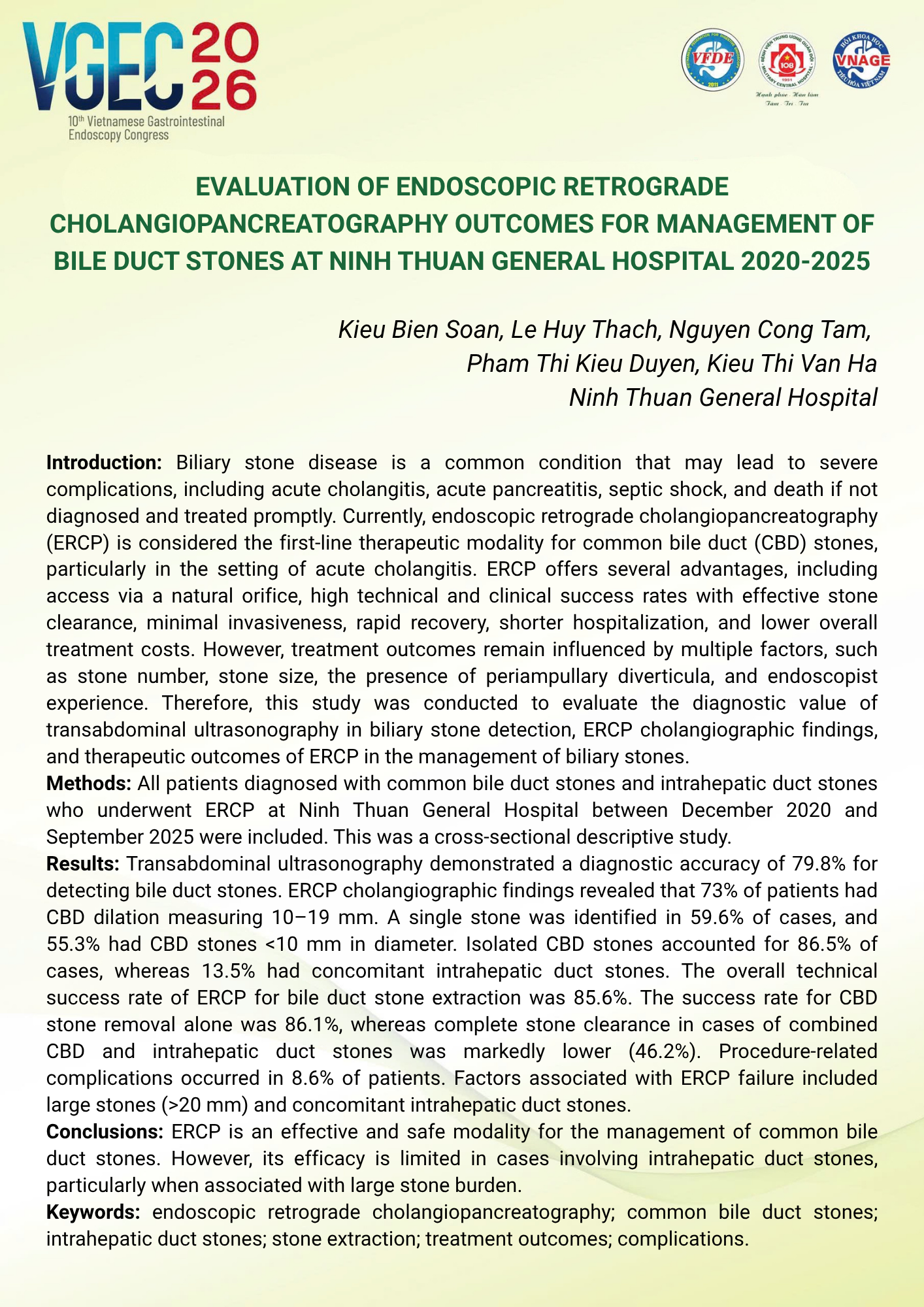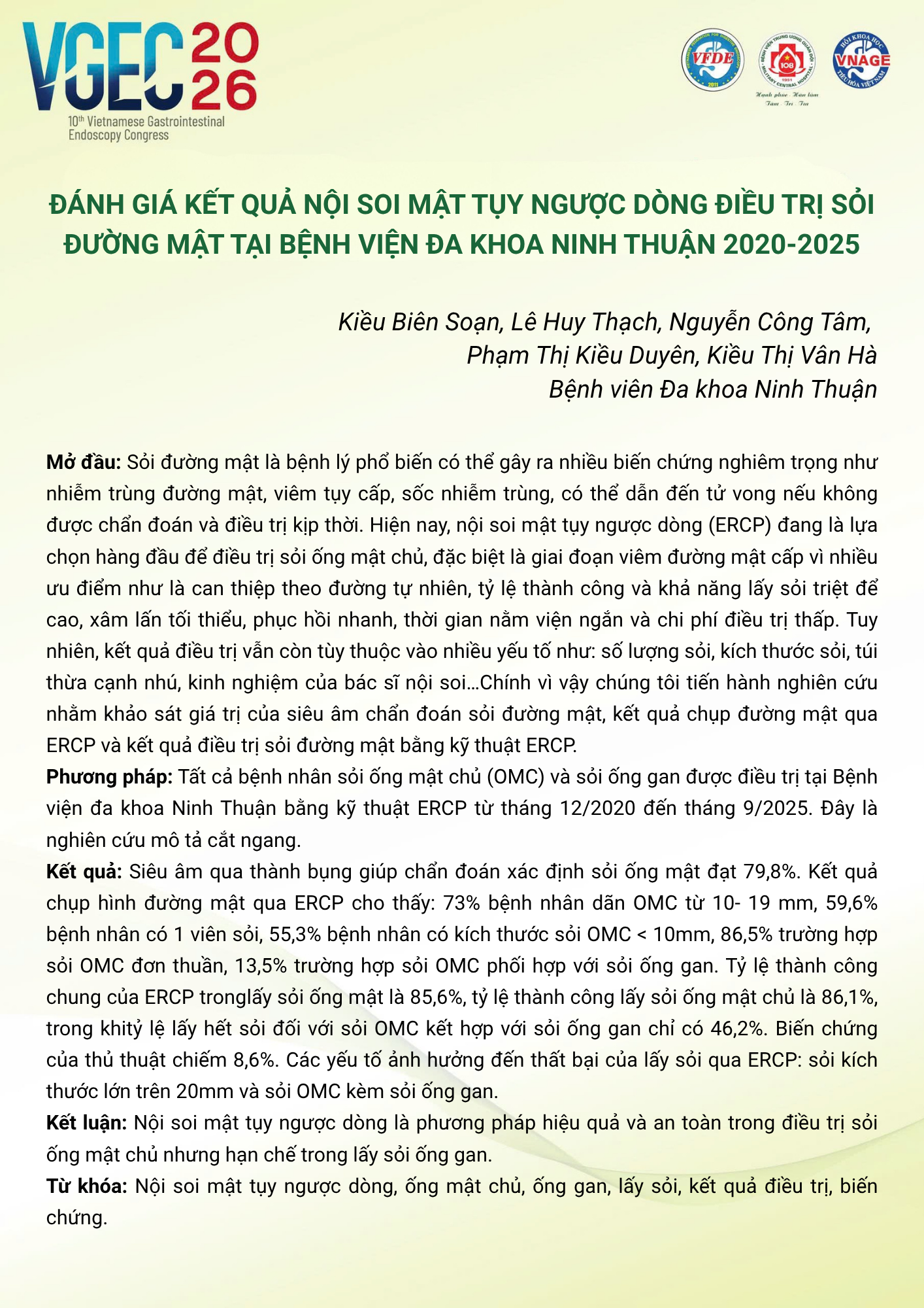 Kết quả điều trị sỏi đường mật bằng nội soi mật tụy ngược dòng (ERCP) tại Bệnh viện Đa khoa Ninh Thuận 2020 -2025