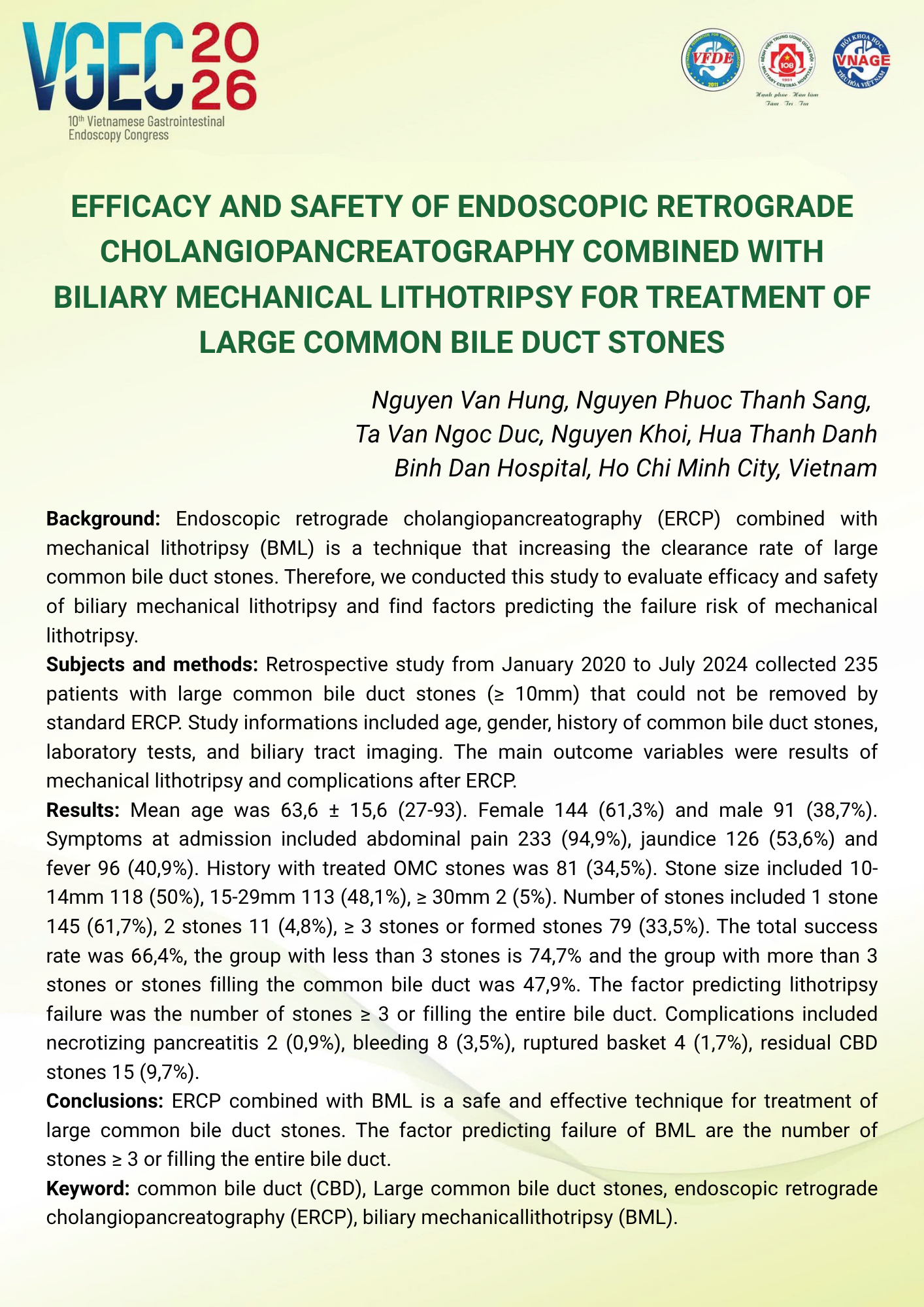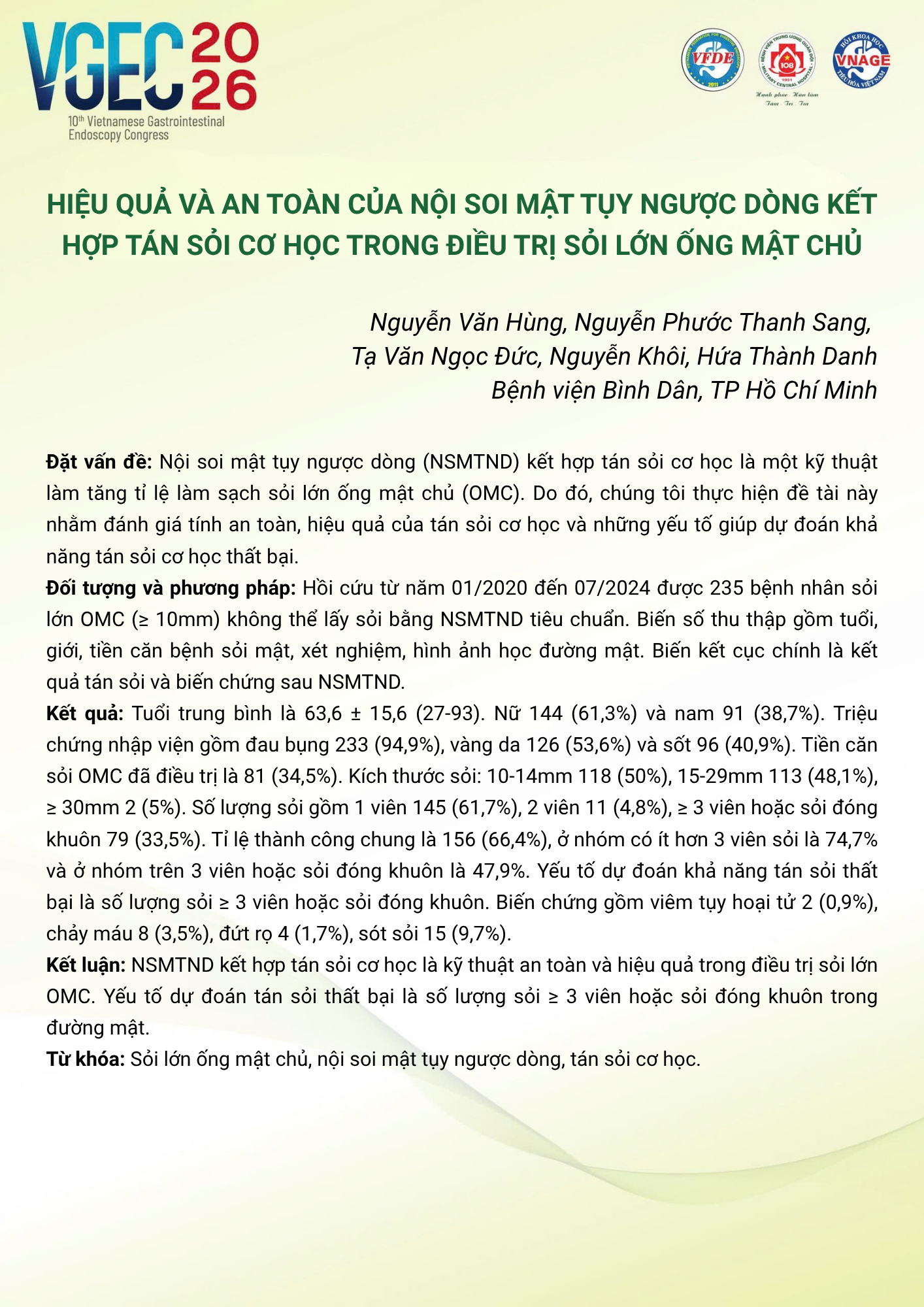 Hiệu quả và an toàn của nội soi mật tụy ngược dòng kết hợp tán sỏi cơ học trong điều trị sỏi lớn ống mật chủ
