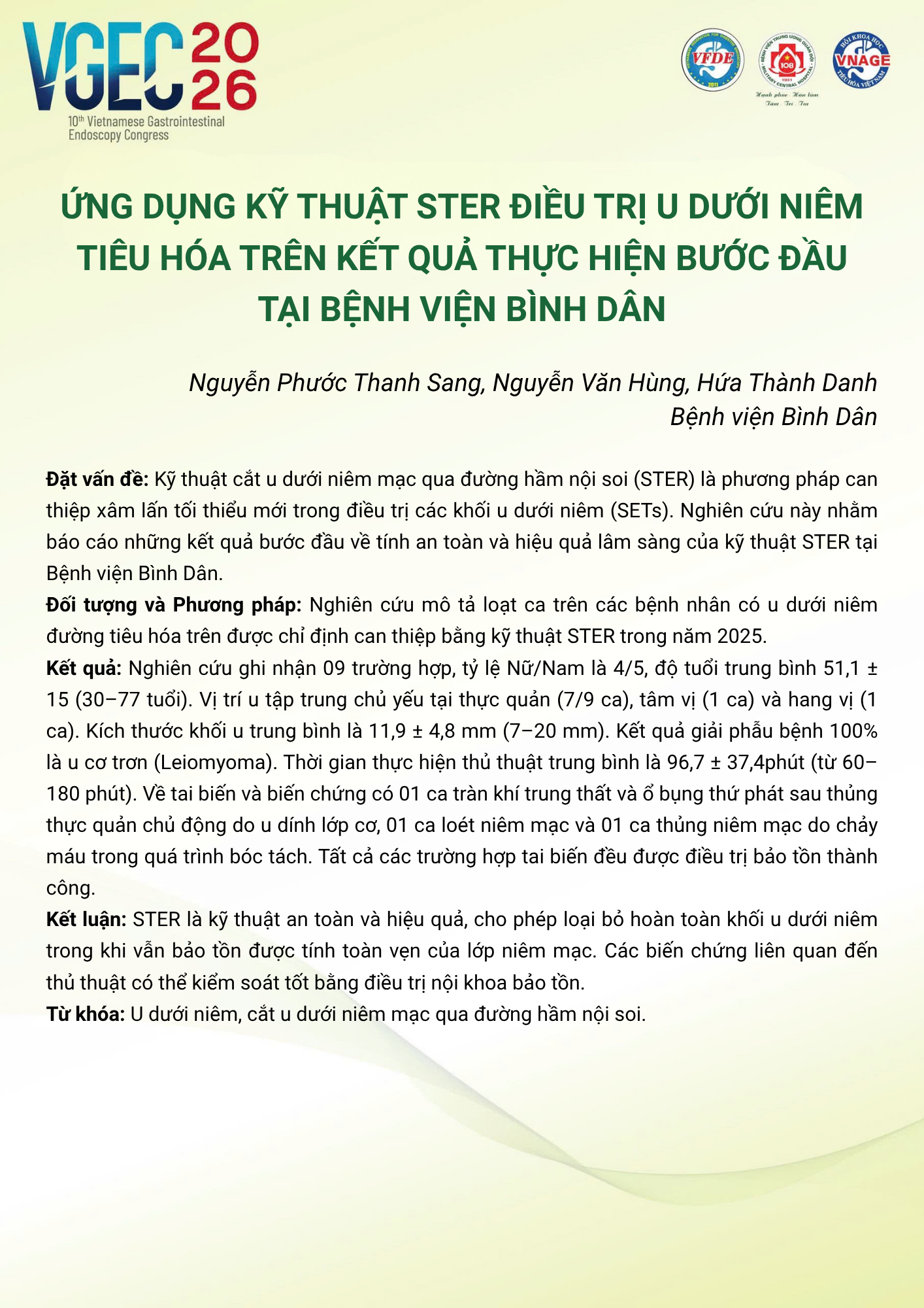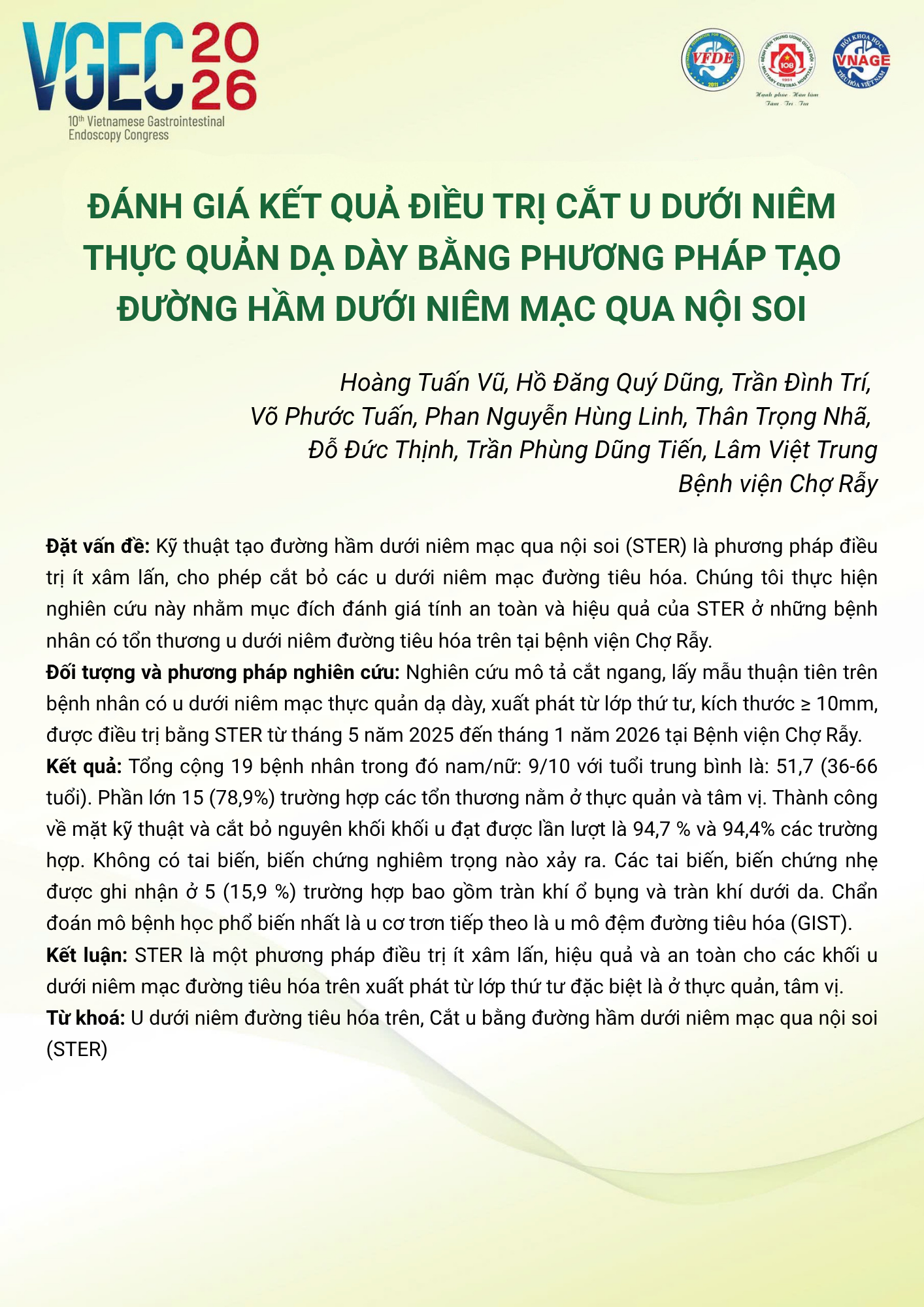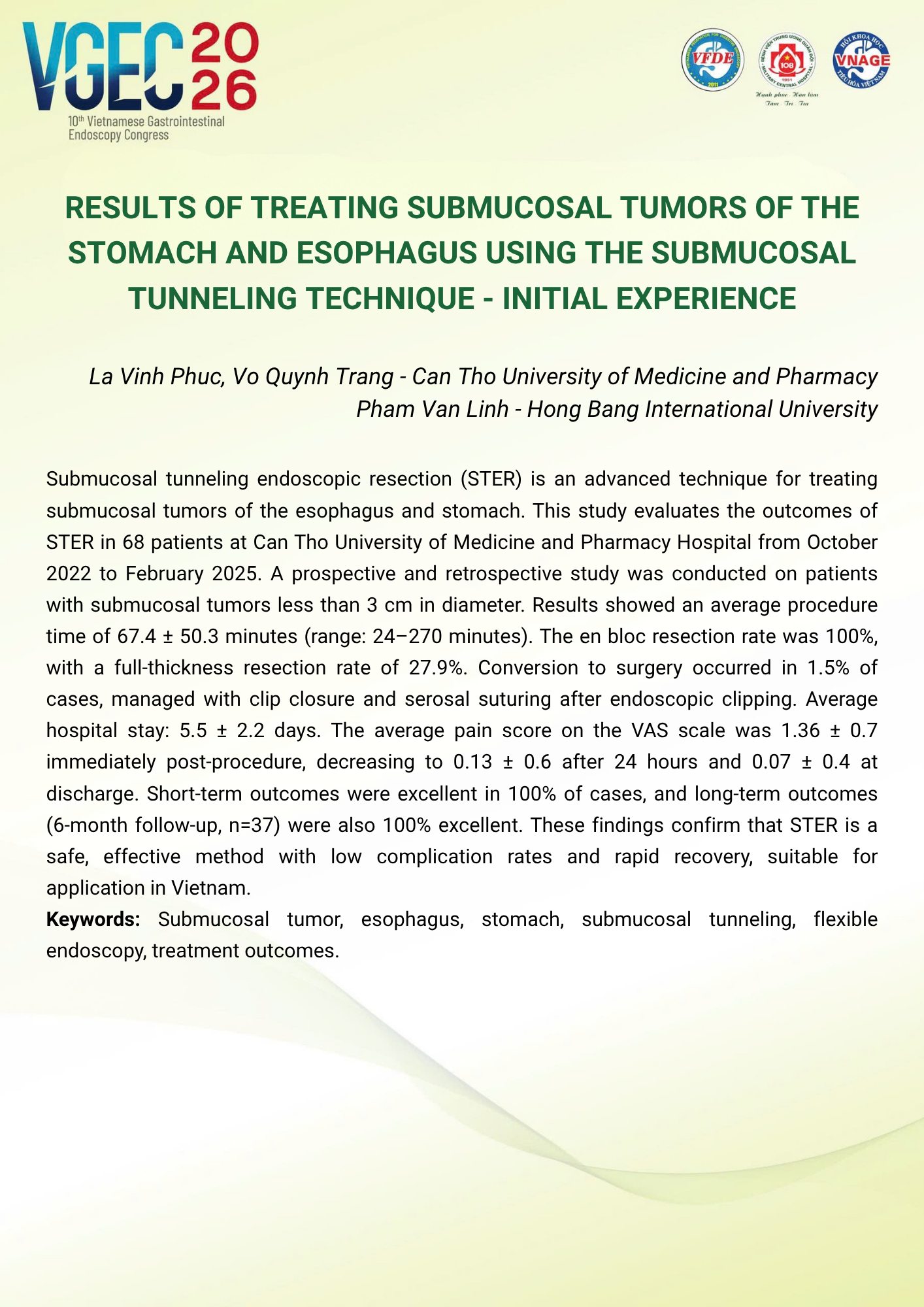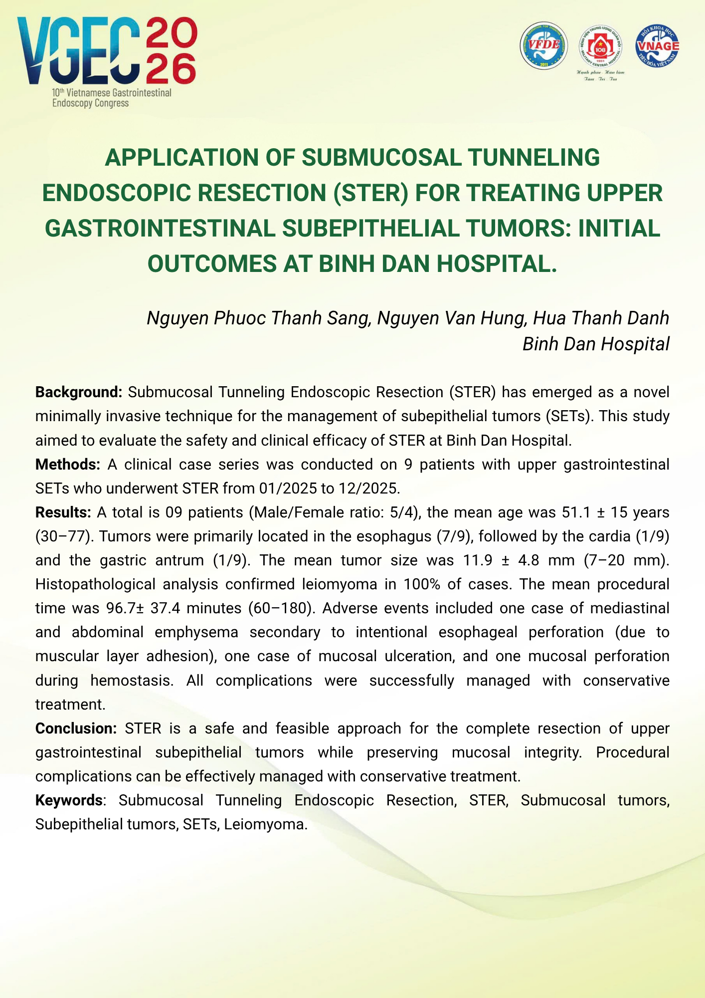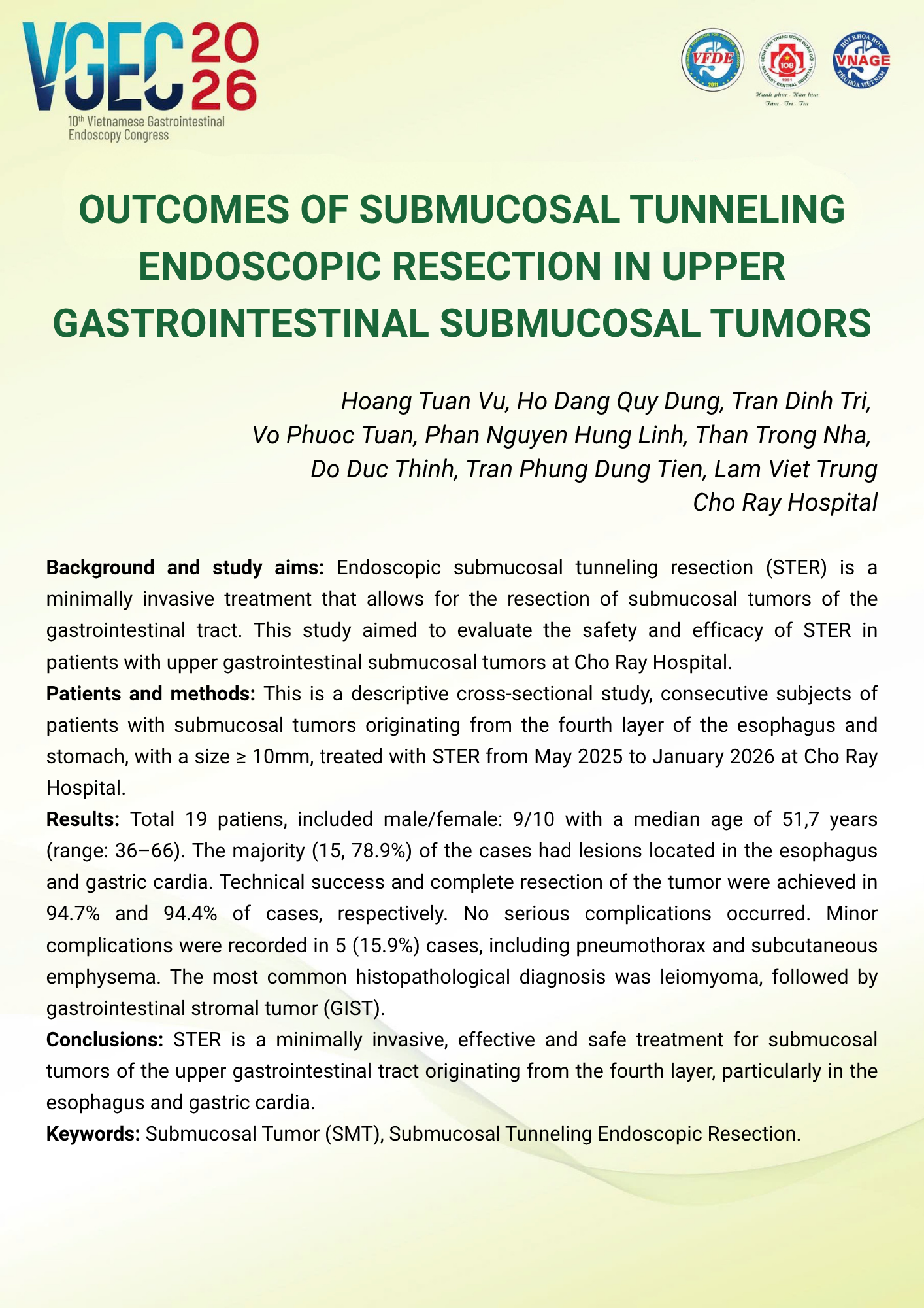 Application of submucosal tunneling endoscopic resection (STER) for treating upper gastrointestinal subepithelial tumors: initial outcomes at Binh Dan Hospital