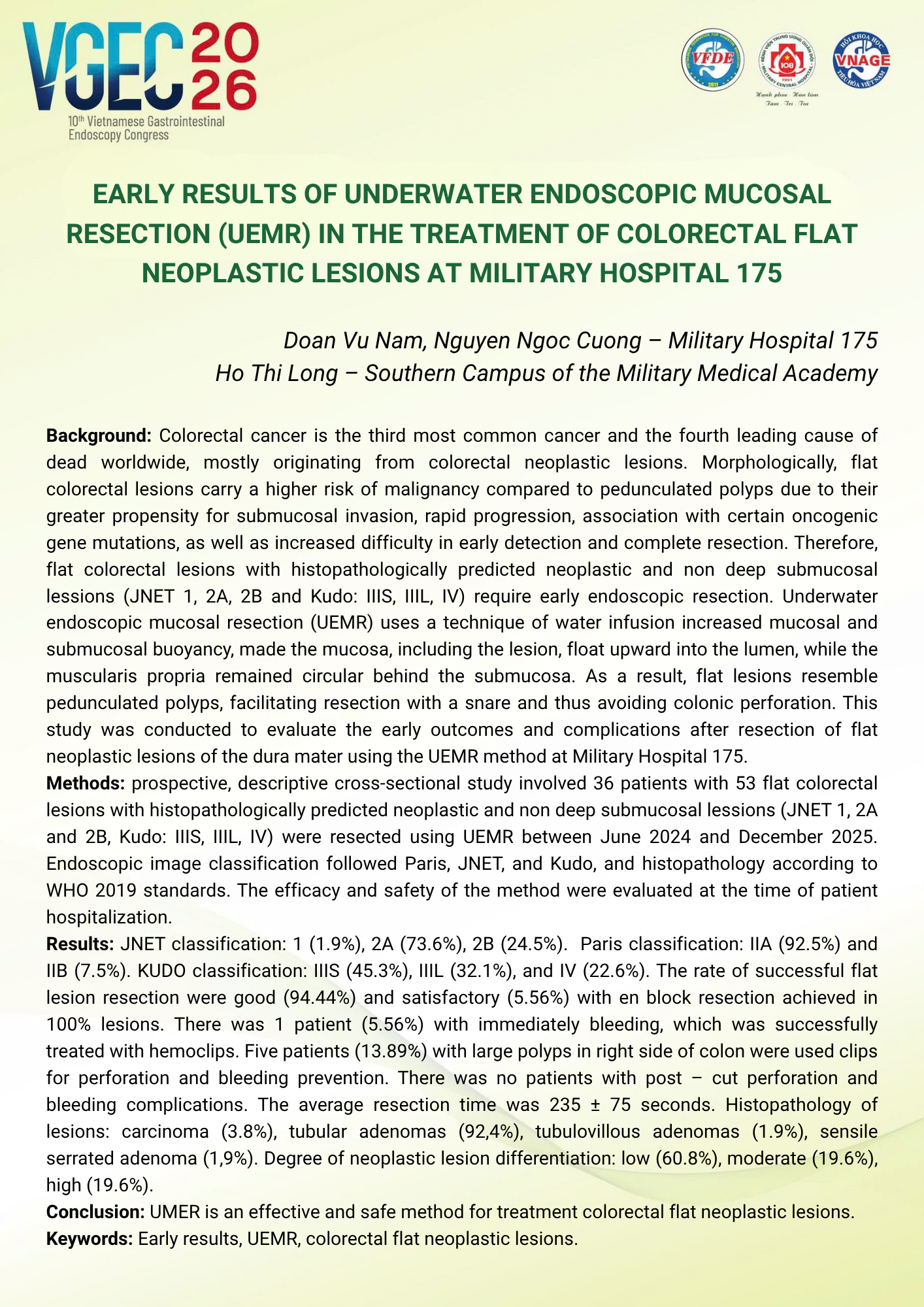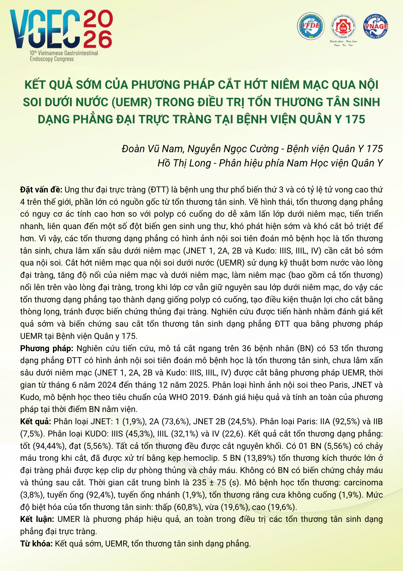 Kết quả sớm của phương pháp cắt hớt niêm mạc qua nội soi dưới nước (UEMR) trong điều trị tổn thương tân sinh dạng phẳng đại trực tràng tại Bệnh viện Quân Y 175