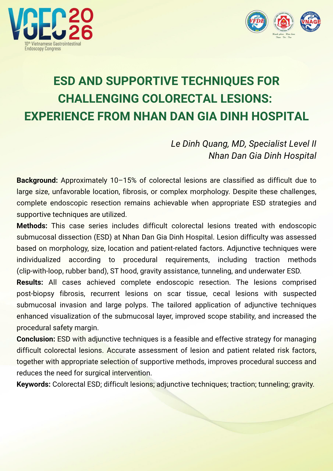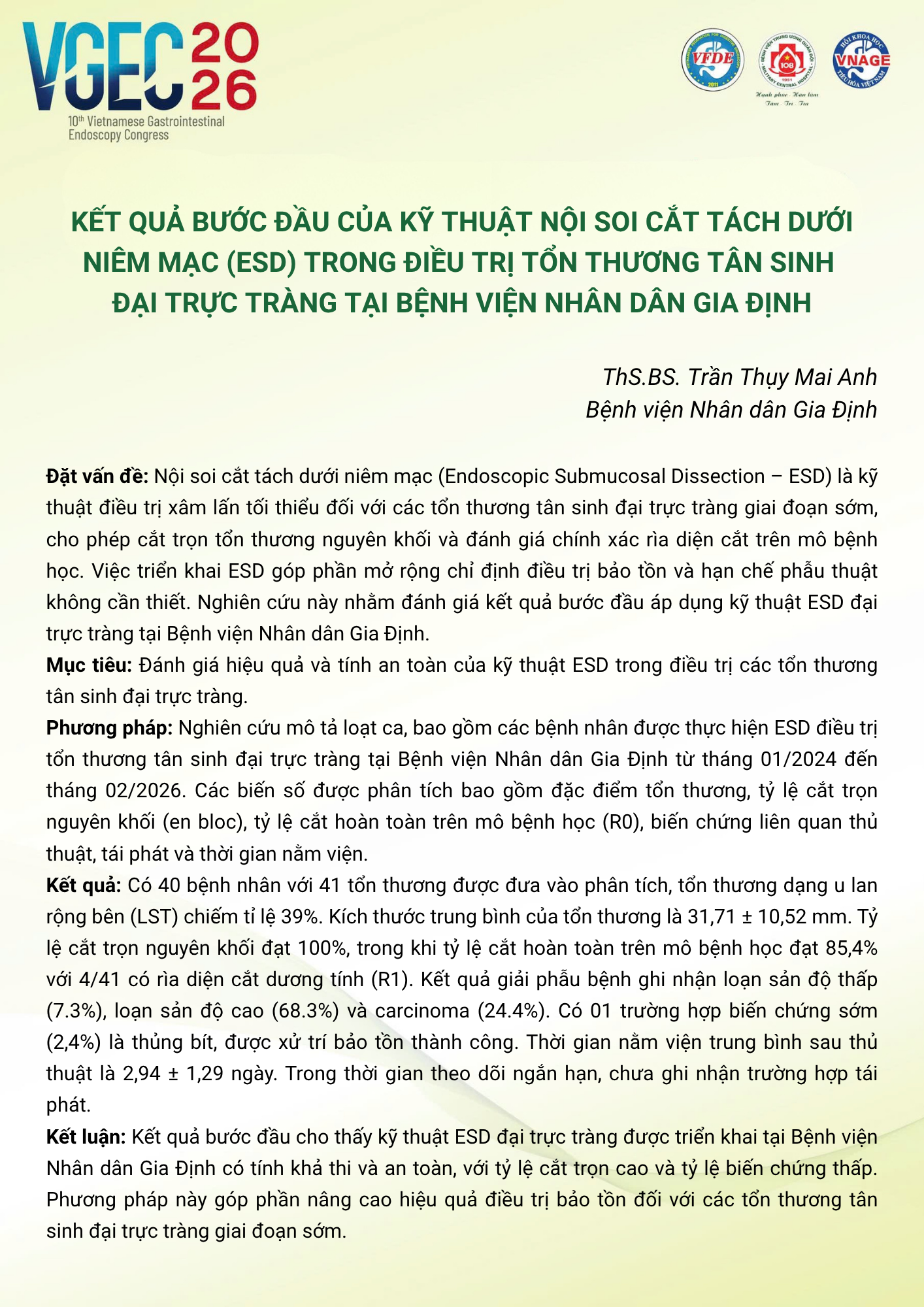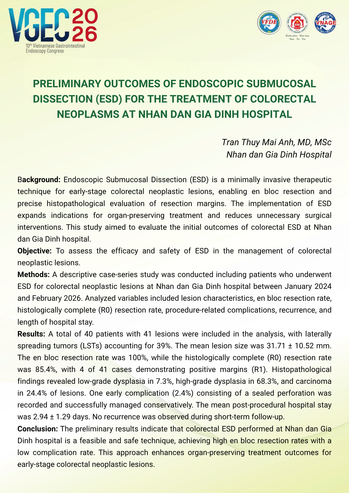 Preliminary outcomes of Endoscopic Submucosal Dissection (ESD) for the treatment of colorectal neoplasms at Nhan dan Gia Dinh Hospital