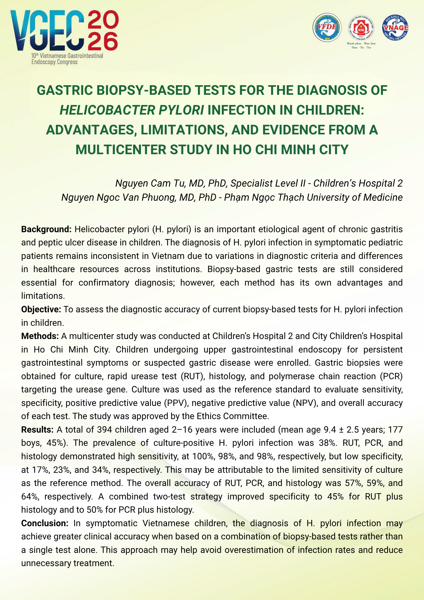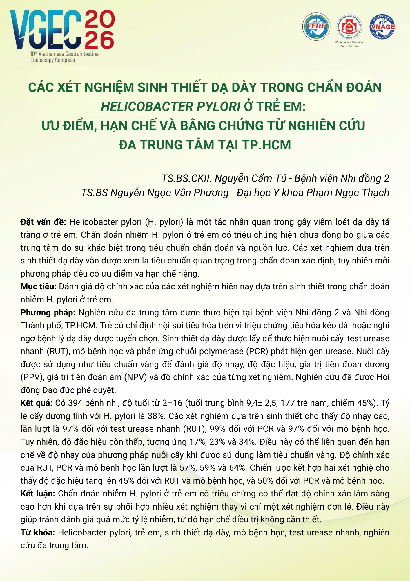 Các xét nghiệm sinh thiết dạ dày trong chẩn đoán Helicobacter pylori ở trẻ em: ưu điểm, hạn chế và bằng chứng từ nghiên cứu đa trung tâm tại TP.HCM