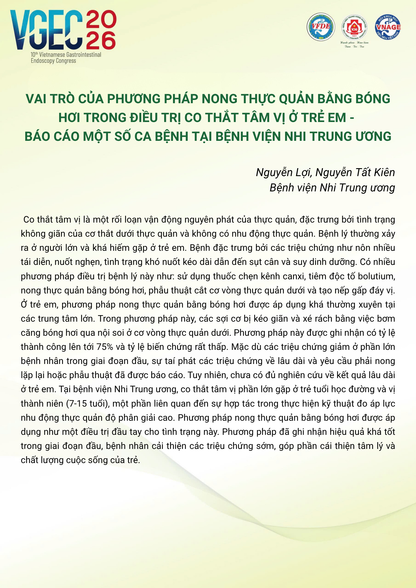 Vai trò của phương pháp nong thực quản bằng bóng hơi trong điều trị co thắt tâm vị ở trẻ em – Báo cáo một số ca bệnh tại Bệnh viện Nhi Trung ương