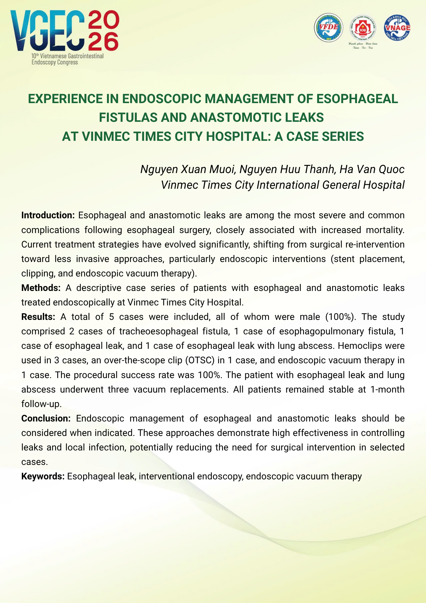 Experience in endoscopic management of esophageal fistulas and anastomotic leaks at Vinmec Times City Hospital: A case series