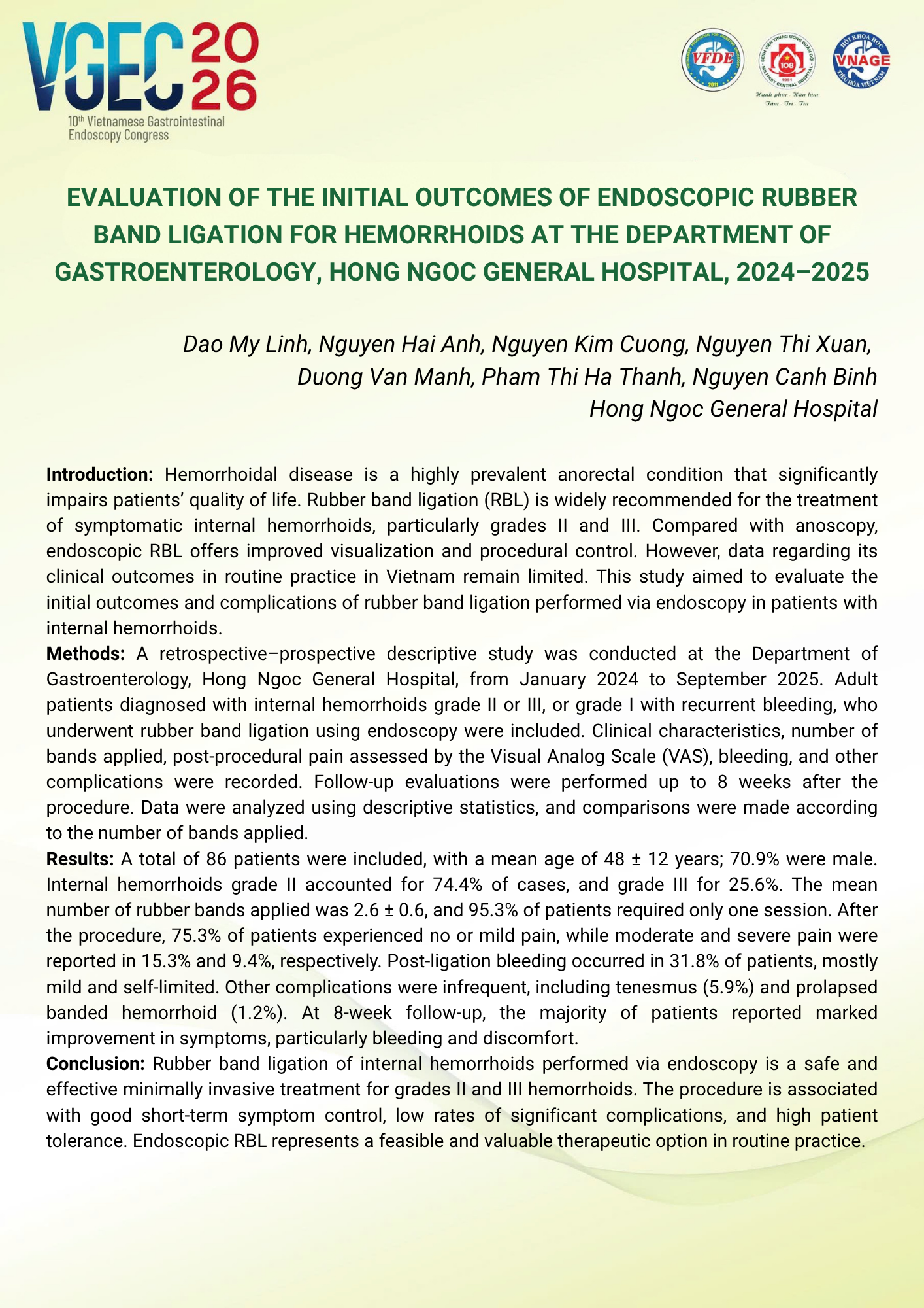 Evaluation of the initial outcomes of endoscopy rubber band ligation for hemorrhoids at the Department of Gastroenterology, Hong Ngoc Hospital 2024–2025