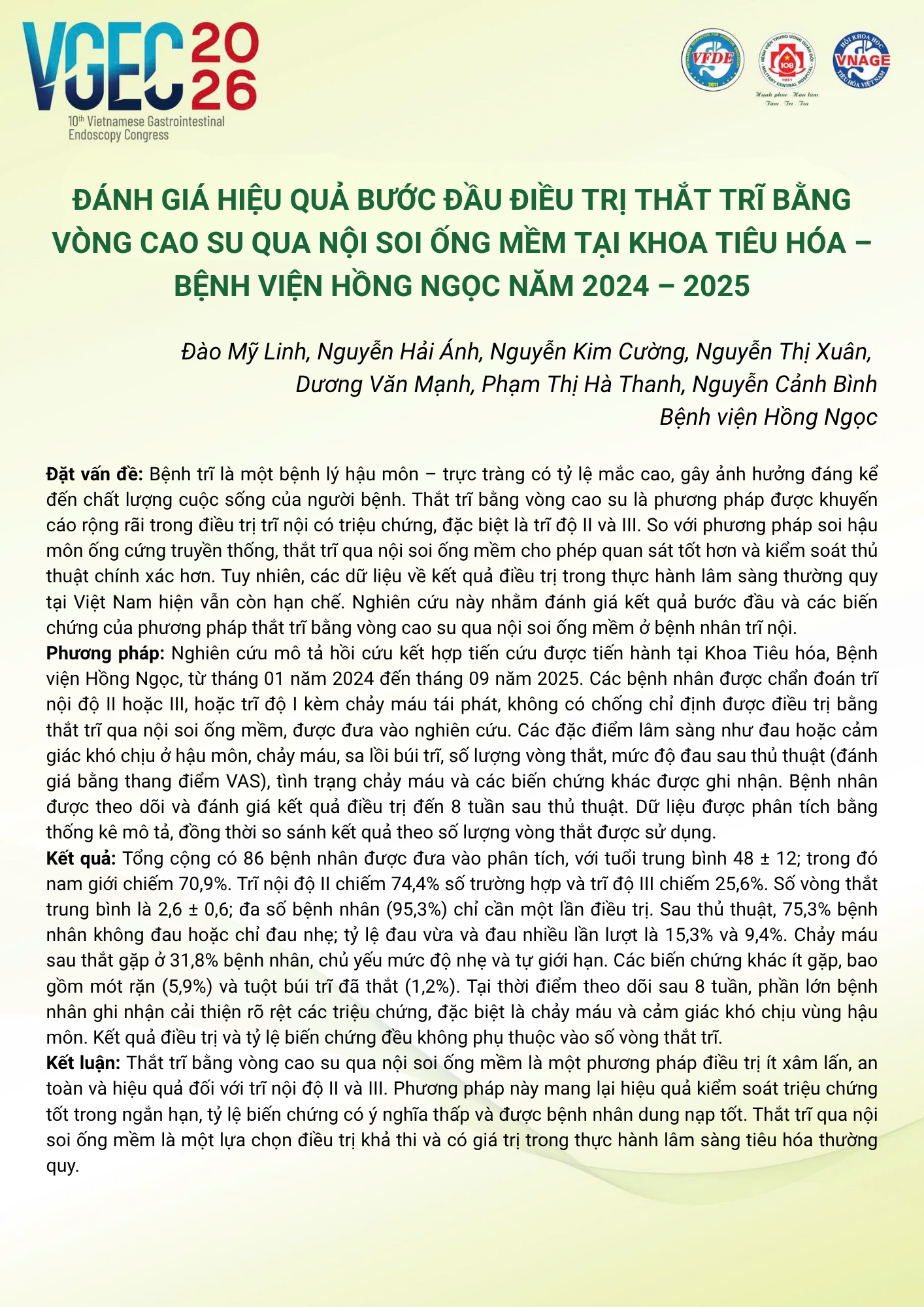Đánh giá kết quả bước đầu trong điều trị thắt trĩ bằng vòng cao su qua nội soi ống mềm tại khoa Tiêu hoá Bệnh viện Hồng Ngọc năm 2024-2025