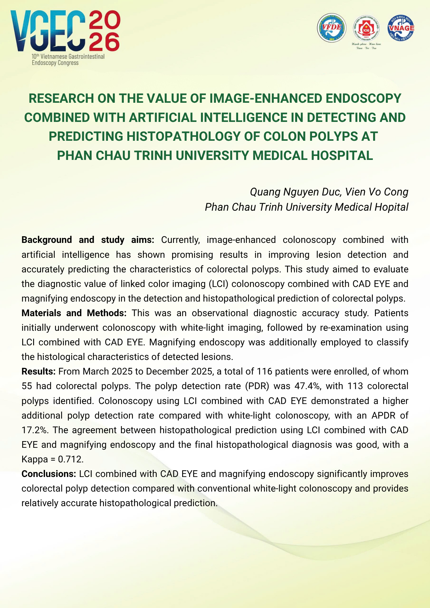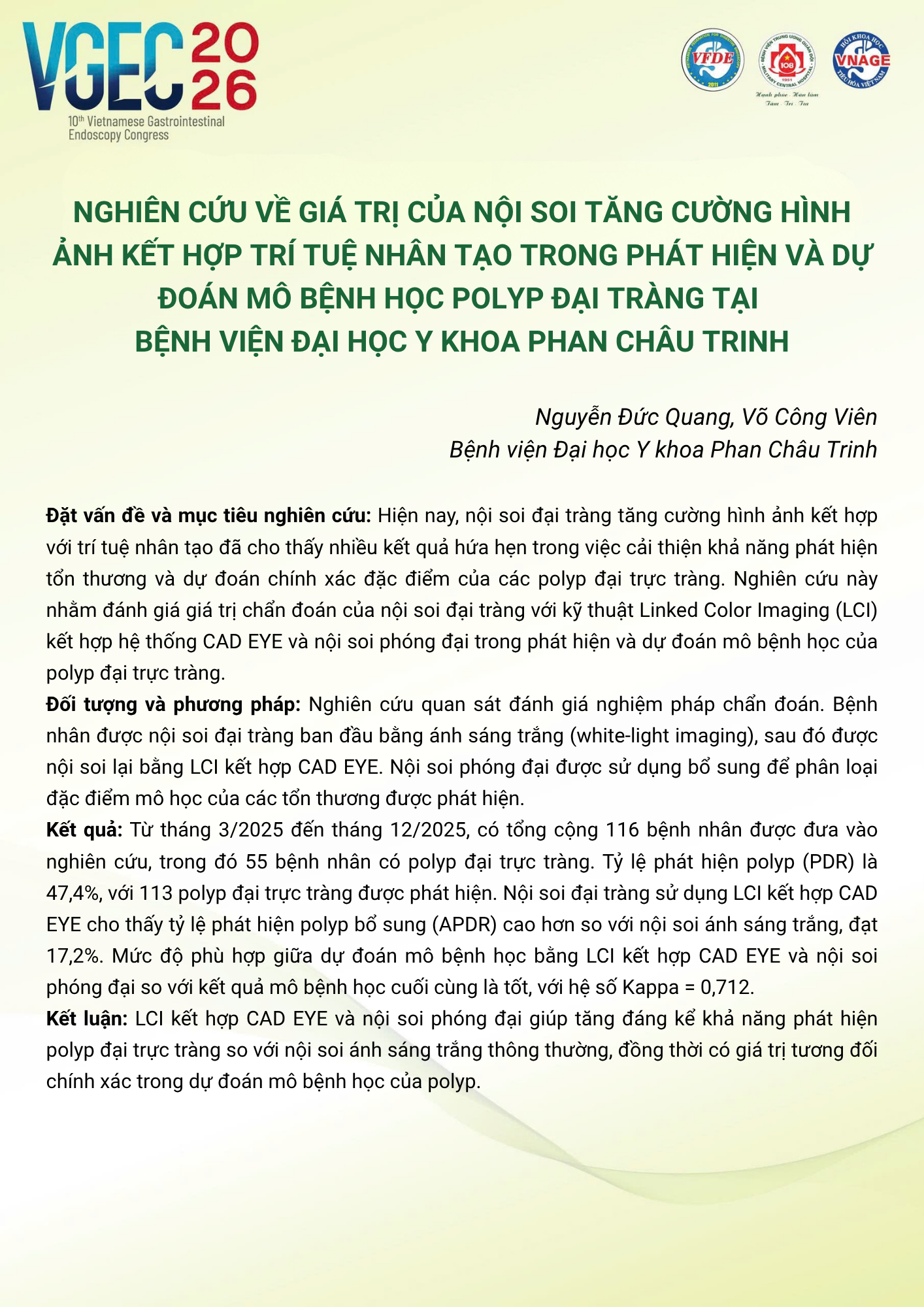 Nghiên cứu giá trị của nội soi tăng cường hình ảnh kết hợp trí tuệ nhân tạo trong phát hiện và dự báo mô bệnh học của polyp đại tràng tại Bệnh viện Đại học Y Khoa Phan Châu Trinh