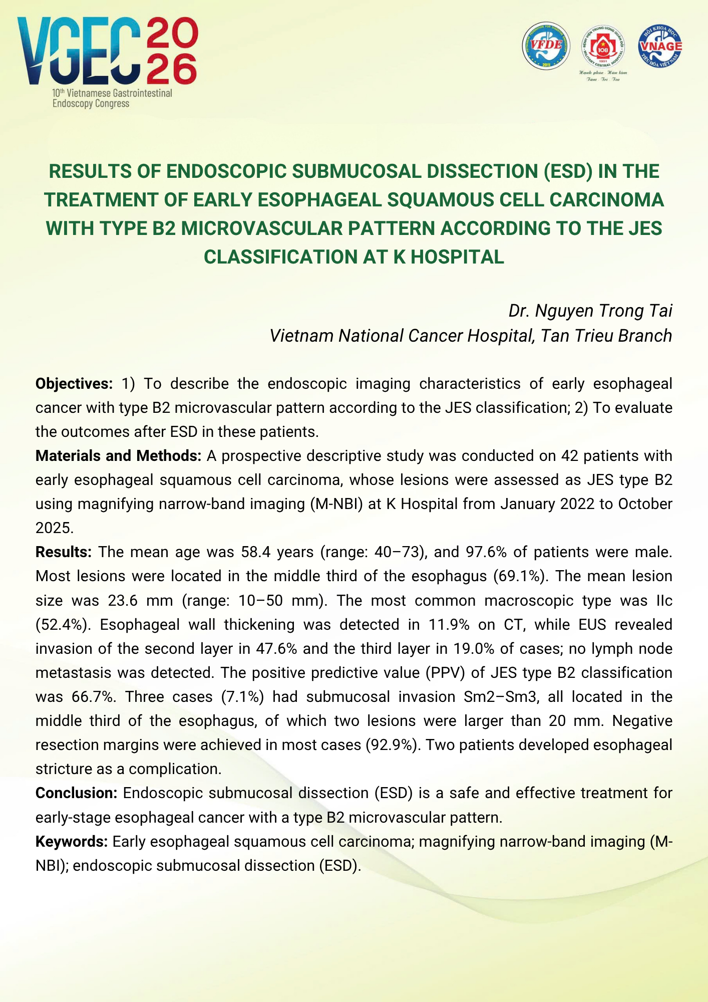 Results of endoscopic submucosal dissection (ESD) in the treatment of early esophageal squamous cell carcinoma with type B2 microvascular pattern according to the JES classification at K hospital