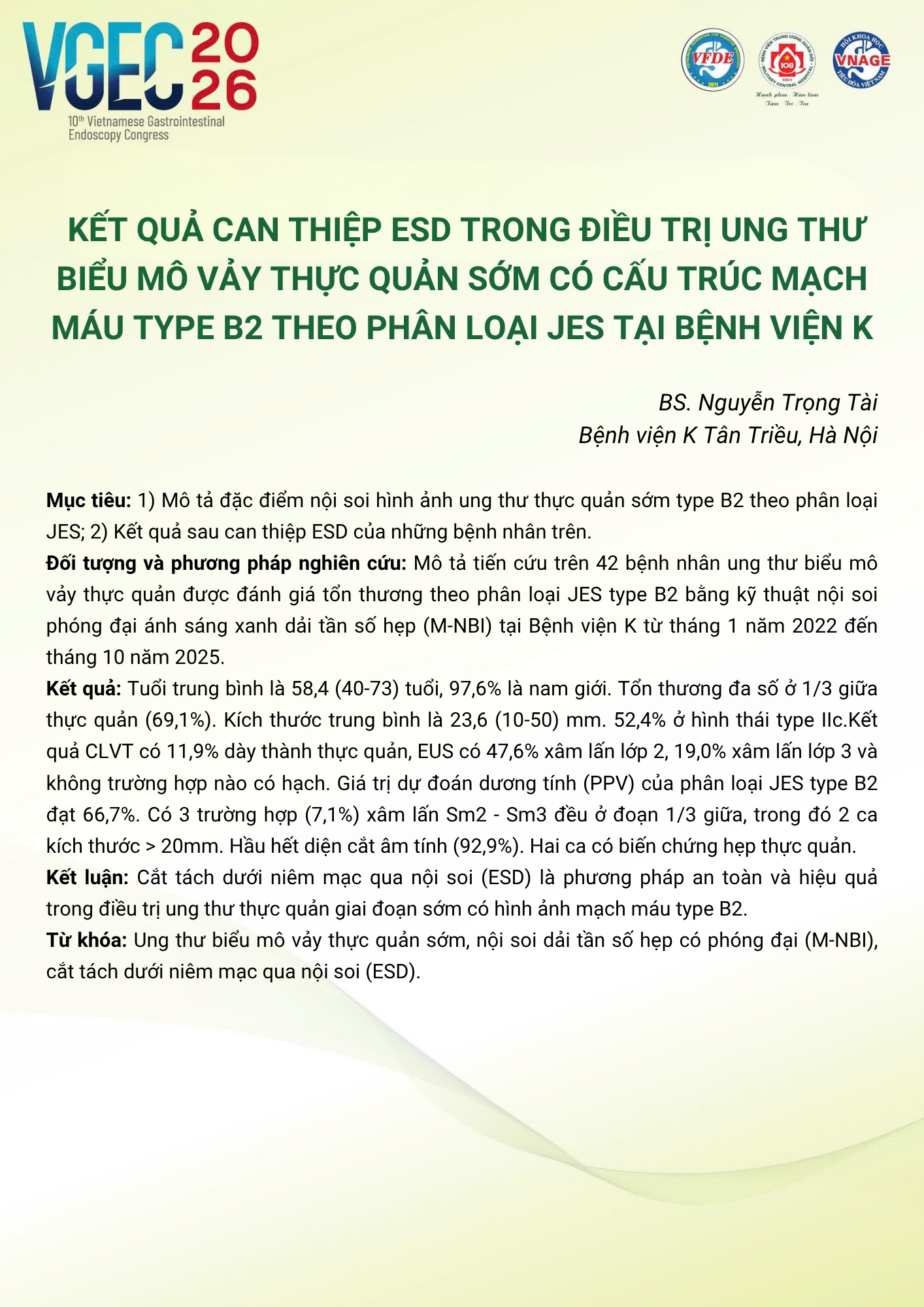 Kết quả can thiệp ESD trong điều trị ung thư biểu mô vảy thực quản sớm có cấu trúc mạch máu type B2 theo phân loại JES tại Bệnh viện K